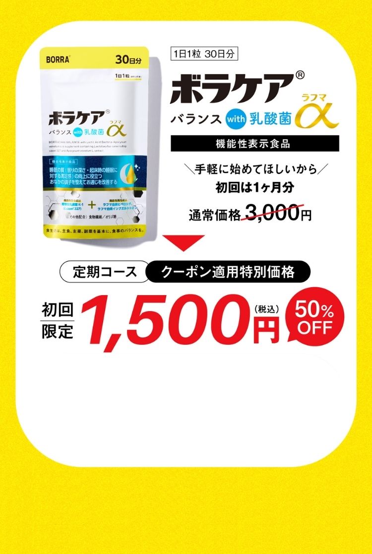 ※定期コースは解約のお申し出がない限り、2回目は初回発送の30日後に60日分(60粒入り1袋)、3回目以降は、60日間隔で60日分(60粒入り1袋)を自動的にお届けするコースです。※初回は50%OFFの1,500円(税込)、2回目以降は10%OFFの4,770円(税込)にてお届けします。 ※全国一律送料無料。※1回目お届け以降お電話でいつでも解約可能、次回発送予定日の7日前までにお手続きをお願いします。 ※定期便の詳細はこちら。