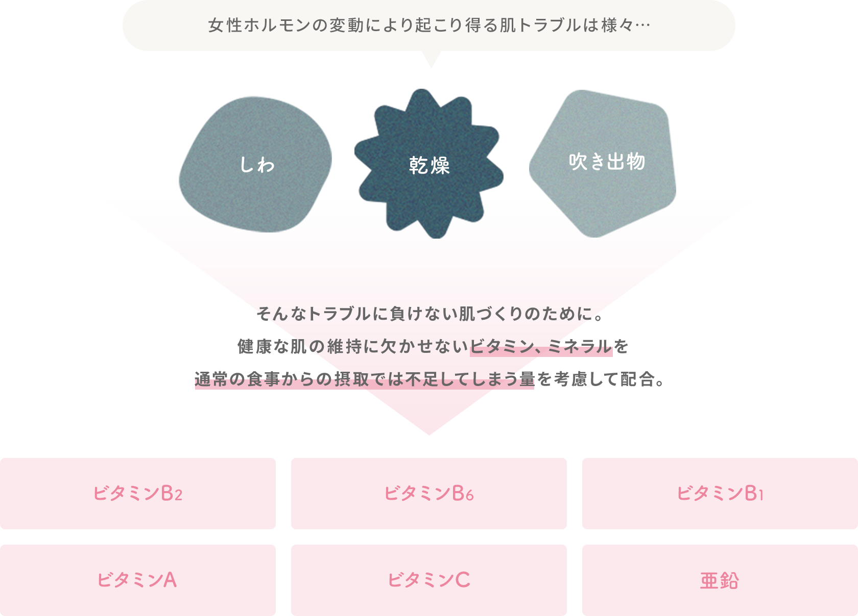 ビタミン、ミネラル配合でゆらぎやすい肌も健やかに。